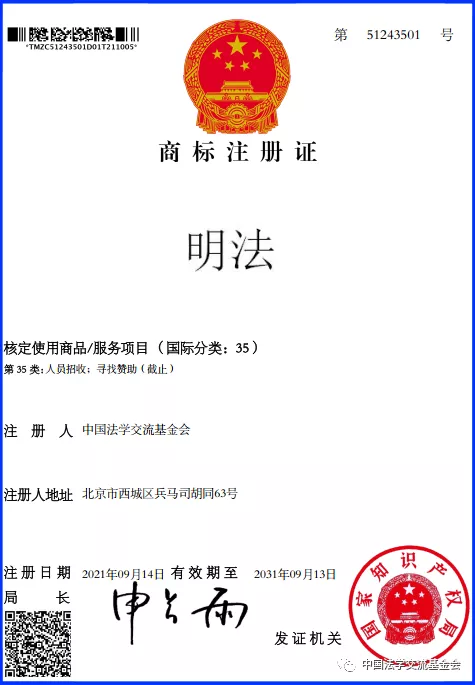 中国法学交流基金会“明法”商标已于2021年9月14日获准注册,核定使用项目为第35类“人员招收、寻找赞助”。第35类主要包括由个人或组织提供的服务,主要目的在于(1)对商业企业的经营或管理进行帮助;(2)对工商企业的业务活动或者商业职能的管理进行帮助;以及由广告部门为各种商品或服务提供的服务,旨在通过各种传播方式向公众进行广告宣传。
